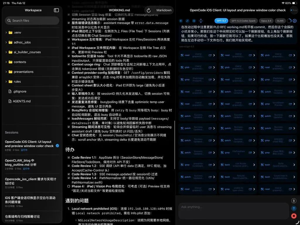 为了解决这个问题,我们做了一个原生的iOS App作为OpenCode的远程客户端。注意这个App不是把聊天窗口搬到手机上——它是一个真正为移动端设计的工作界面:能看到AI的实时工作进度,每一步工具调用、每一个文件操作;能切换模型做A/B测试;能浏览Markdown文件和审查更改;支持语音输入;支持基于HTTPS或者SSH隧道的公网访问;iPad上还有三栏分屏。