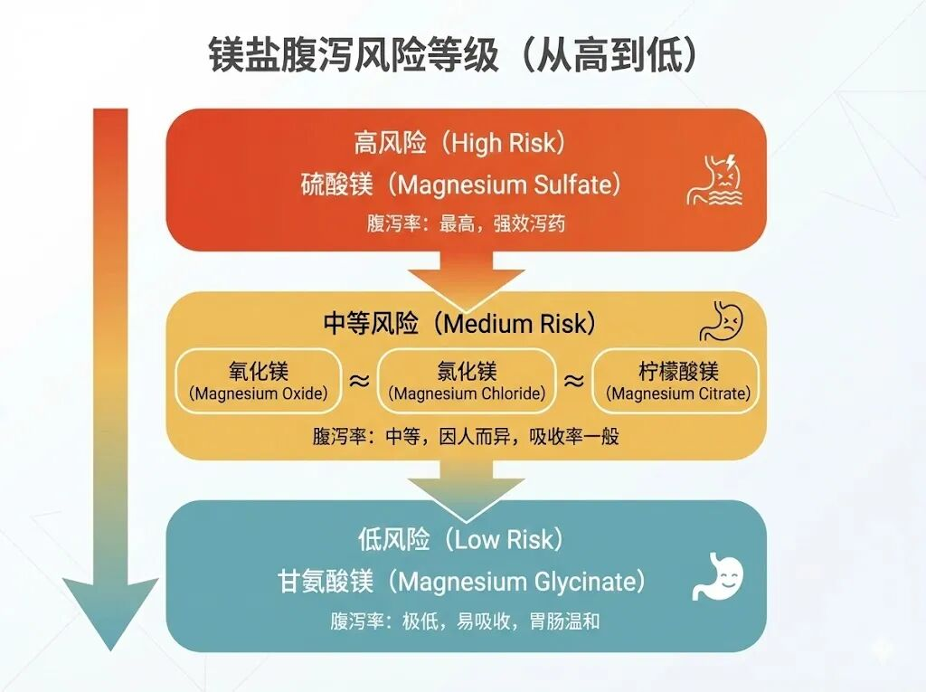 从腹泻率来说,硫酸镁>氧化镁≈氯化镁≈柠檬酸镁>甘氨酸镁
