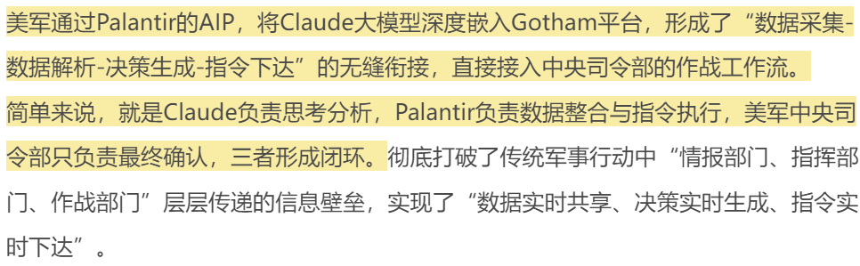 早在2月初,美军就已经完成了Claude与Palantir系统的深度集成,并且秘密接入了美军中央司令部的作战工作流,相当于给战争机器装上了“超级大脑”+“神经中枢”。