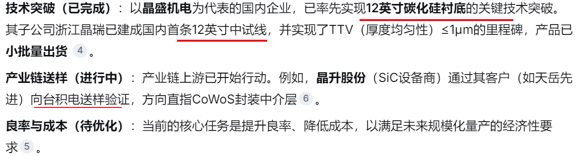 最大的亮点:12英寸技术的突破性进展。晶盛机电是目前国内少数在12英寸碳化硅衬底上取得实质性突破的企业。其子公司浙江晶瑞不仅建成了中试线,还实现了TTV(厚度均匀性)≤1μm的关键指标,并已小批量出货。这为其在AR眼镜光学波导和先进封装中介层等前沿领域抢占了先机。