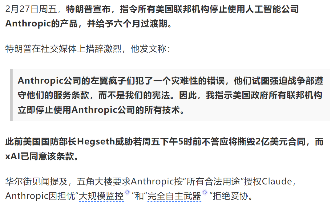 2 月 26 日深夜,Amodei 公开表示不会妥协。第二天,副部长在 X 上骂他是“说谎者”、“有上帝情结”。然后,川普发文,要求所有联邦机构立即停用 Anthropic 技术,并给了六个月的过渡期,白宫的官方账号转发,然后还给 Anthropic 贴上了供应链风险标签。