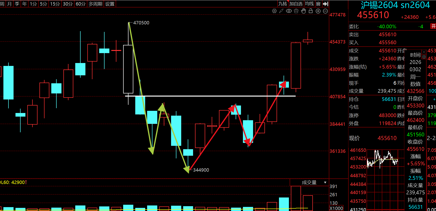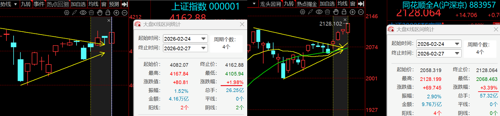 一、当日行情分析1、市场观察—外部因素上周A股市场呈现"周期资源强势领涨、科技板块震荡调整"的结构性分化格局,上证指数周涨0.8%(4162点),月线斩获三连阳,2月累计上涨1.09%,中证2000指数表现亮眼,全月涨幅达4.8%,远超其他主要指数。周期资源板块全面爆发,有色金属成为最强主......一、当日行情分析