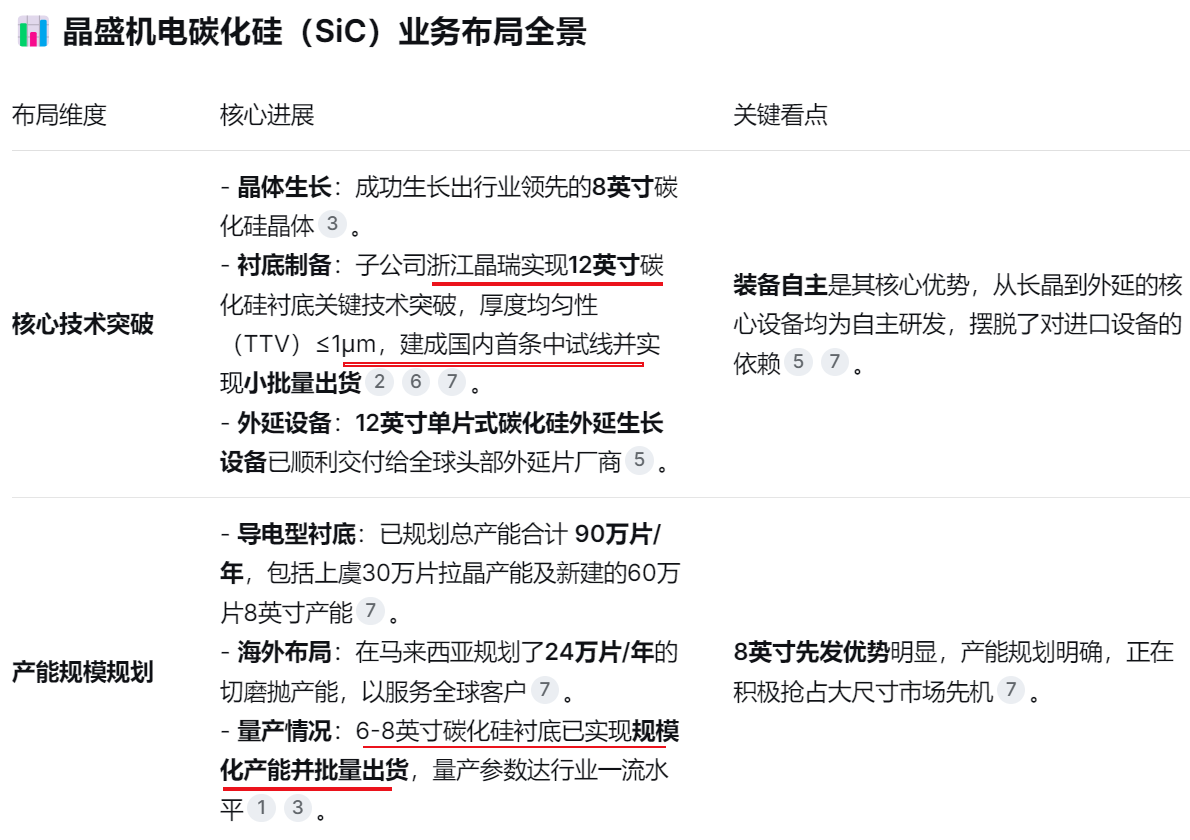 晶盛机电在碳化硅(SiC)领域的布局,可以用一句话概括:以“装备+材料”的协同模式,构建了从长晶设备、衬底材料到外延设备的全产业链能力,并在大尺寸(8英寸/12英寸)技术上形成了显著的先发优势。