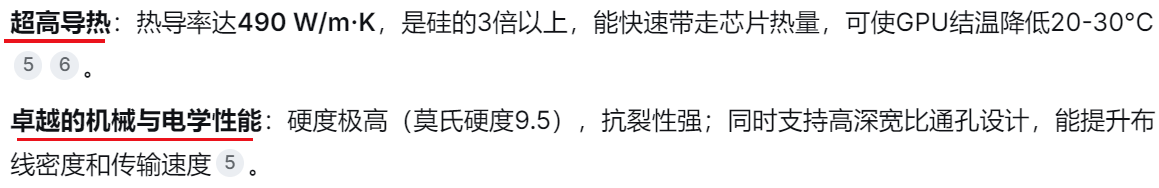 AI芯片功耗的激增,让传统封装难以招架。英伟达H100峰值功耗已超700W,下一代Rubin甚至直奔1800W 。功耗激增带来的“功耗墙”问题,成为制约AI芯片性能释放的核心瓶颈。在此背景下,碳化硅凭借其优异的物理性能,成为替代传统硅中介层的最优解。