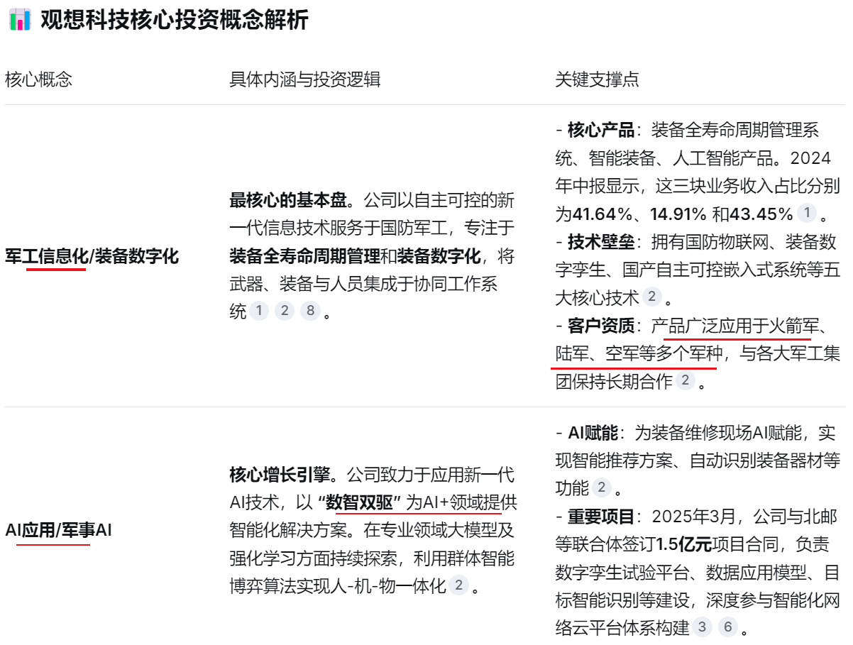 观想科技(301213)是一家深扎军工领域、以“软件定义硬件”为核心的科技公司。它的核心投资概念可以概括为:立足国防信息化,通过“数据+算法+算力”的全栈能力,向低空经济、商业航天、第三代半导体等战略新兴领域延伸。