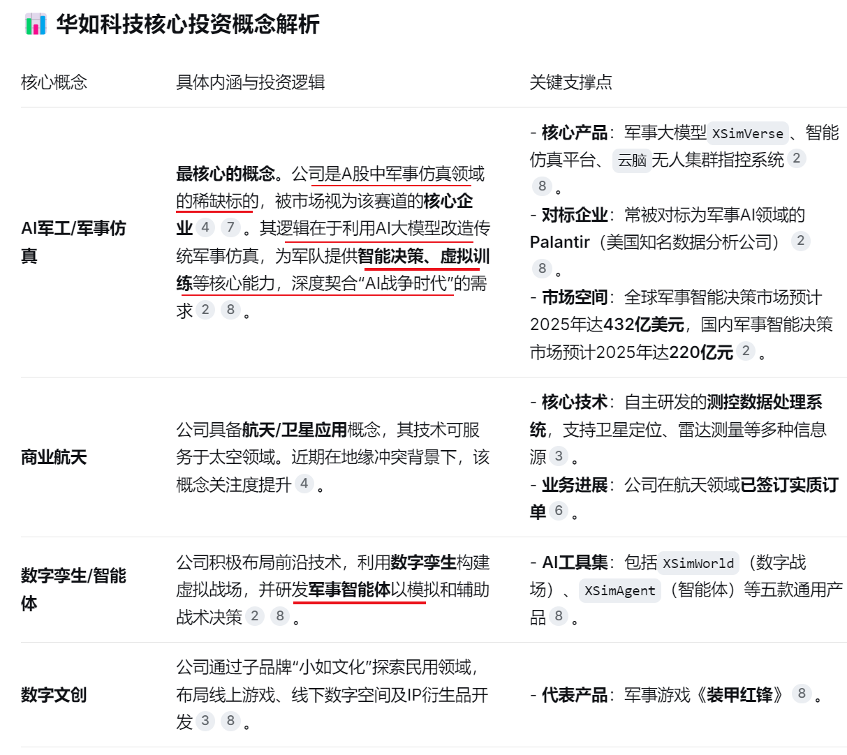 华如科技(301302)的核心投资概念围绕 “军事智能” 展开,可被视为一家专注于垂直领域的人工智能(AI)公司。其本质是利用AI、大数据和仿真技术,为国防军事打造一个“数字战场”,服务于作战推演、训练和装备论证。