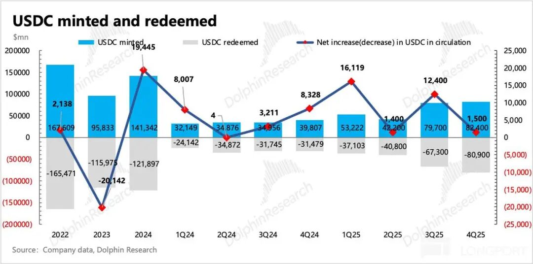 (1)四季度平均USDC流通值762亿,10月达到高点800亿后,季末回落至753亿,环比增长2%,显著放缓。当期新铸币824亿,赎回销毁809亿,由此看出,需求场景/用户在拓宽,但无奈当期因加密资产抛售而赎回的USDC也在增加。