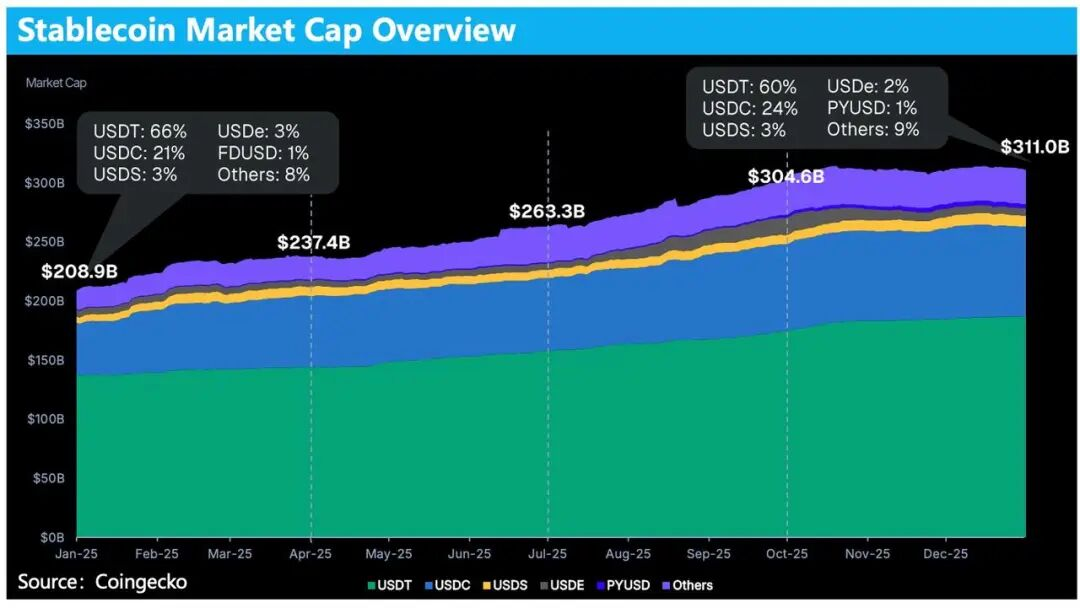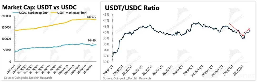 与此同时,1月中旬延期审批的《CLARIFY法案》,其中对稳定币监管归属的争议担忧,也助推了个人投资者更青睐监管环境“模糊”、主要流通在离岸市场的USDT,而非USDC。反过来,若3月新折中方案得到多方认可并推进,法案逐步落地后,北美机构下场则会更青睐USDC。