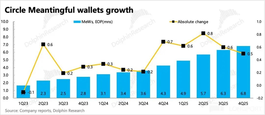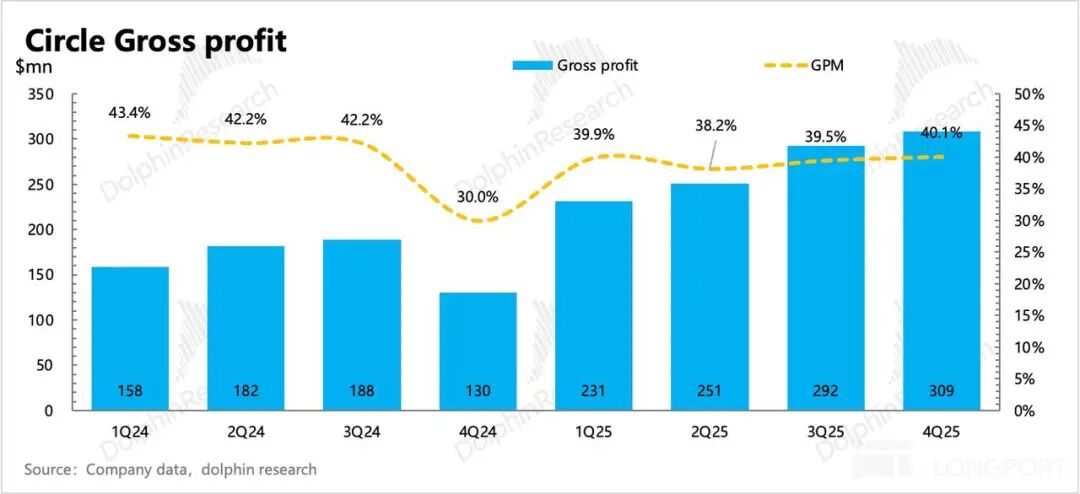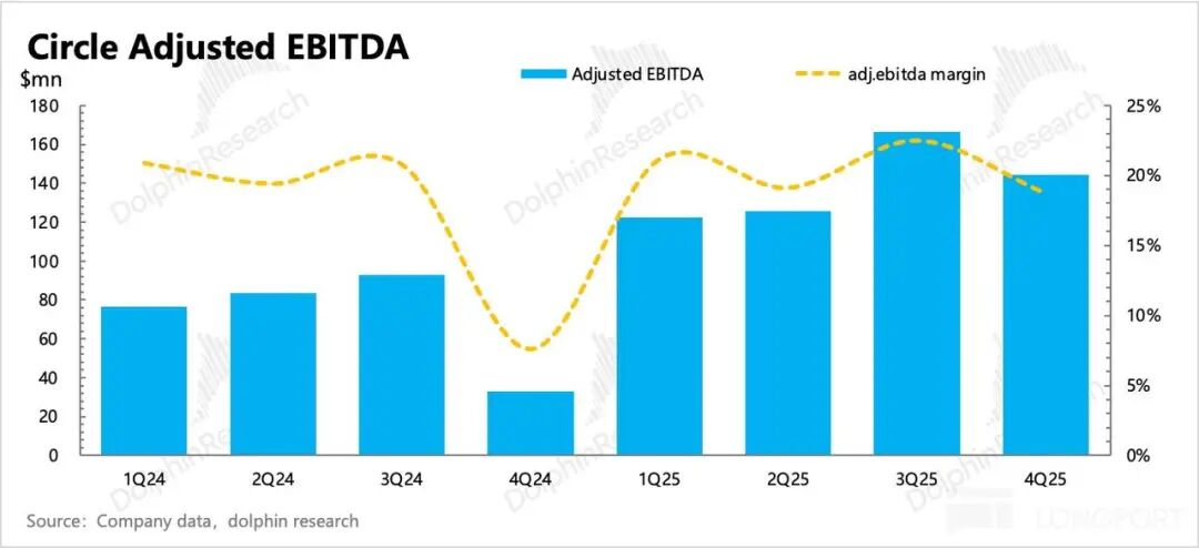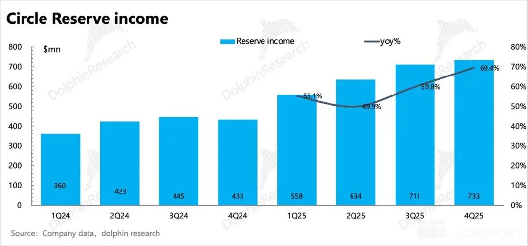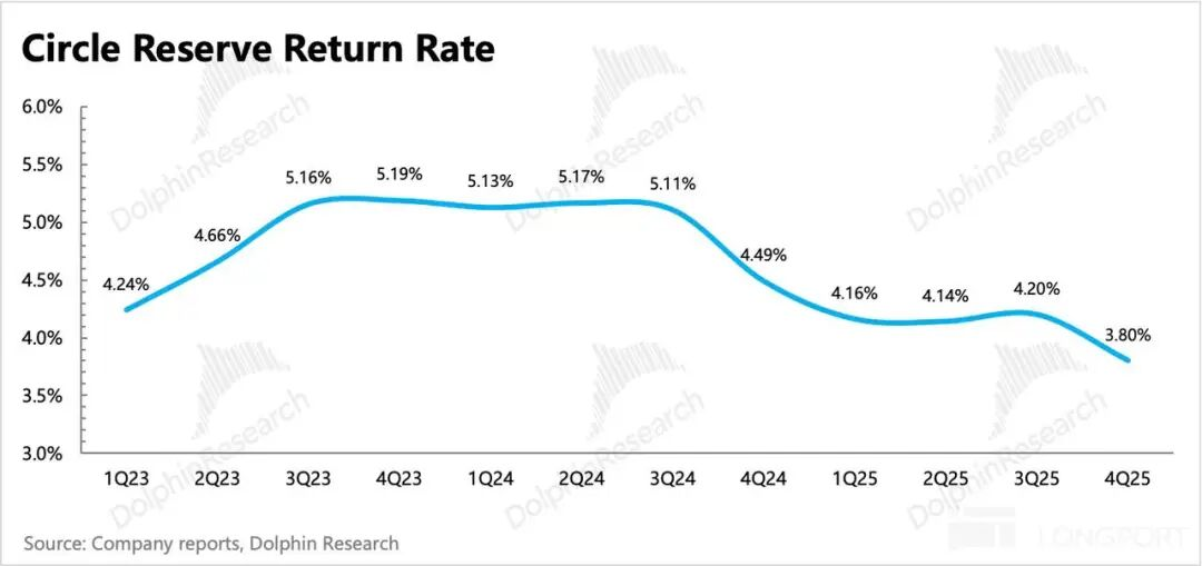 而占大头的主要收入,受到USDC扩张节奏,以及当下国债利率环境的影响。四季度USDC平均规模同比扩张100%,利率下滑至3.8%,同比下降70bps,最终储备利息收入增速69%,因前一年低基数而相比三季度有所反弹。