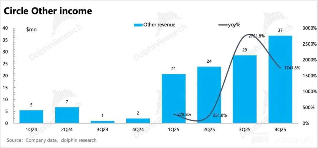 由于Circle收入中,占比95%的储备资产利息收入基本上可以说是公开数据,因此能产生预期差的主要就是其他收入,而四季度表现是继续超预期。
