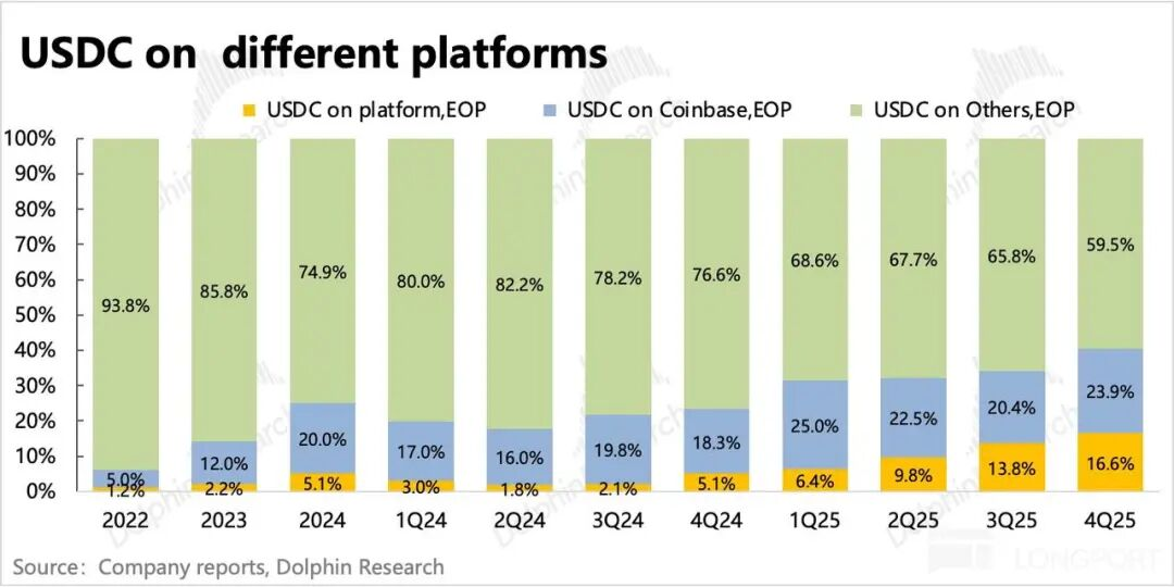 USDC在不同渠道分布上,Circl内部持有占比继续提升,达到16.6%。