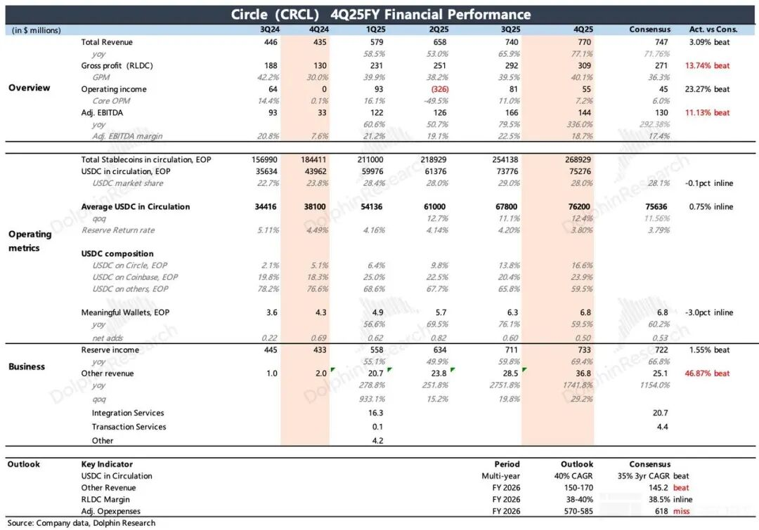美东2月25日盘前,稳定币USDC发行方$Circle(CRCL.US)发布了2025年第四季度业绩。虽然占比最大的储备资产利息收入因为USDC市值和联邦利率数值公开,其大概的表现比较透明,并且Circle股价波动也并非与业绩挂钩,但我们仍然可以通过财报中的其他收入&分成占比、经营费用、指引等情况,观......本文来自微信公众号: 海豚研究 ,作者:海豚君,原文标题:《Circle:用业绩回击唱衰,稳定币第一股能站 “稳” 吗?》